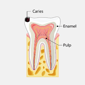 虫歯は、口腔内の虫歯菌が食事の食べかすなどに含まれる糖分から酸を生成し、その酸により歯が溶けることで起こります。 歯垢や歯石は細菌の温床となります。それらを放置すると、周囲の歯肉を刺激し歯肉炎となり、最終的には歯周病を引き起こします。 一方で、細菌が作り出した酸はエナメル質を溶かし歯に穴を作っていきます。 初期には目立った自覚症状は現れませんが、進行するにつれて次のような症状が現れます。虫歯の進行状態